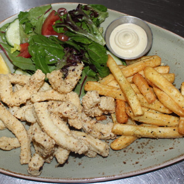 Lemon Pepper Calamari $24.90 Dusted with Polenta Flour Mix. Served with Chips and Salad Category: Mains