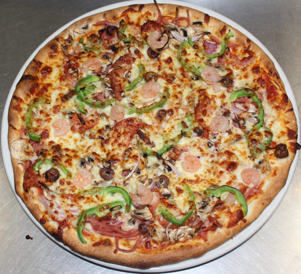 Tomato, Mozzarella, Ham, Mushroom, Spanish onion, Capsicum, Olive, Salami, Prawns, Anchovies