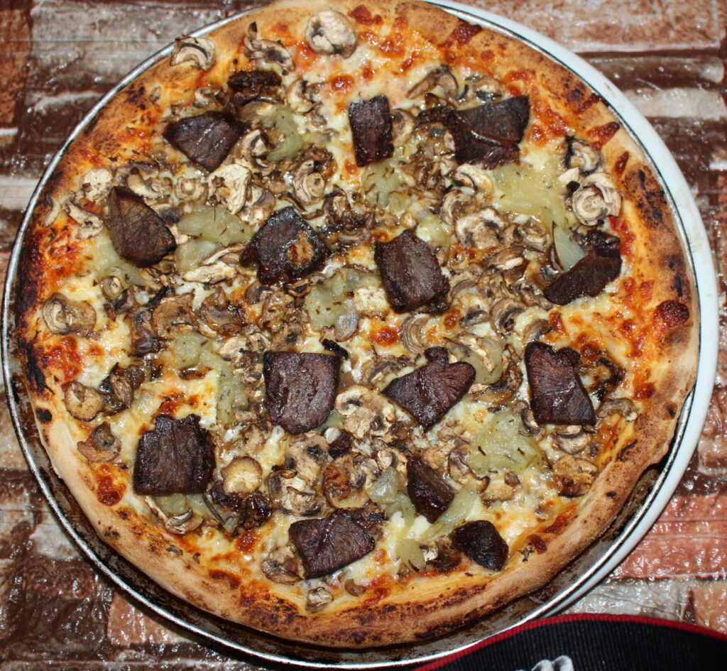 tomato ,mozzarella,mushroom,caramalised onion and slow cooked beef