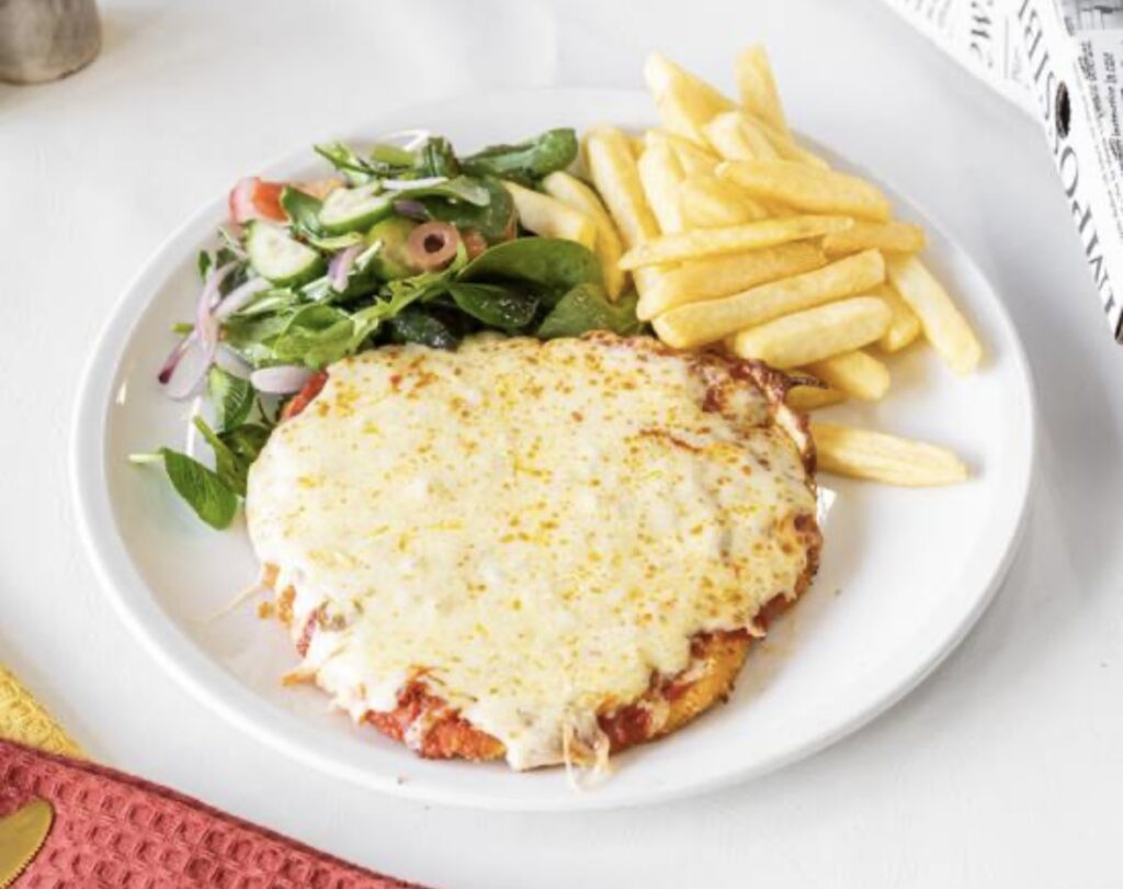$24.90Freshly Crumbed chicken breast. With Napoli, Mozzarella Cheese. Served with chips and salad.